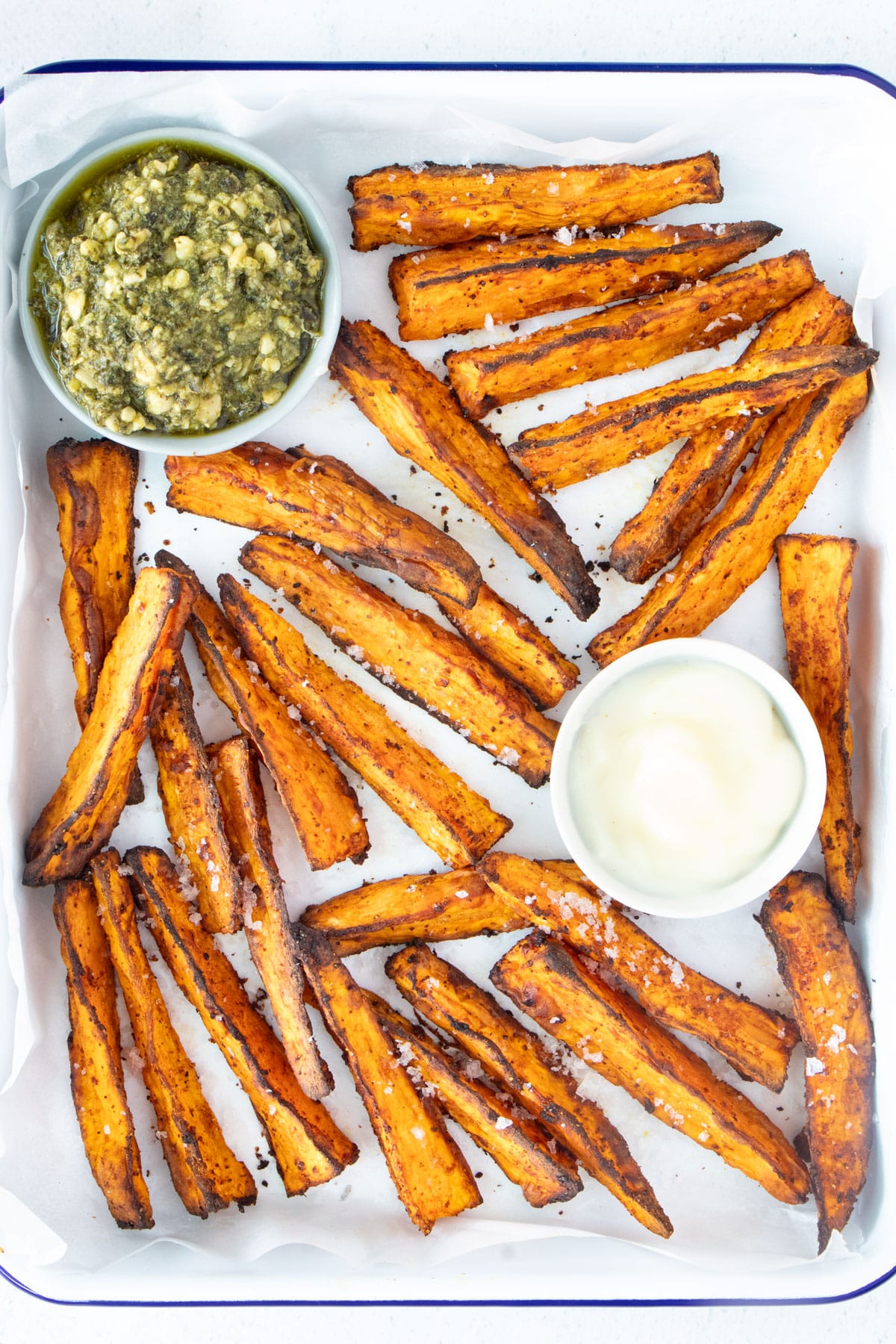 A word on crispiness. Plenty of recipes will promise you crispy wedges using sweet potatoes. The thing is – they simply don’t crisp up the same way white potatoes do. Even when fried. Sweet potatoes are slightly higher in starch and much higher in sugar than white potatoes. This makes them brown far more quickly on the outside while the inside softens and becomes creamy. It’s this combination of factors that prevents the wedges from forming a very crisp or crunchy exterior.