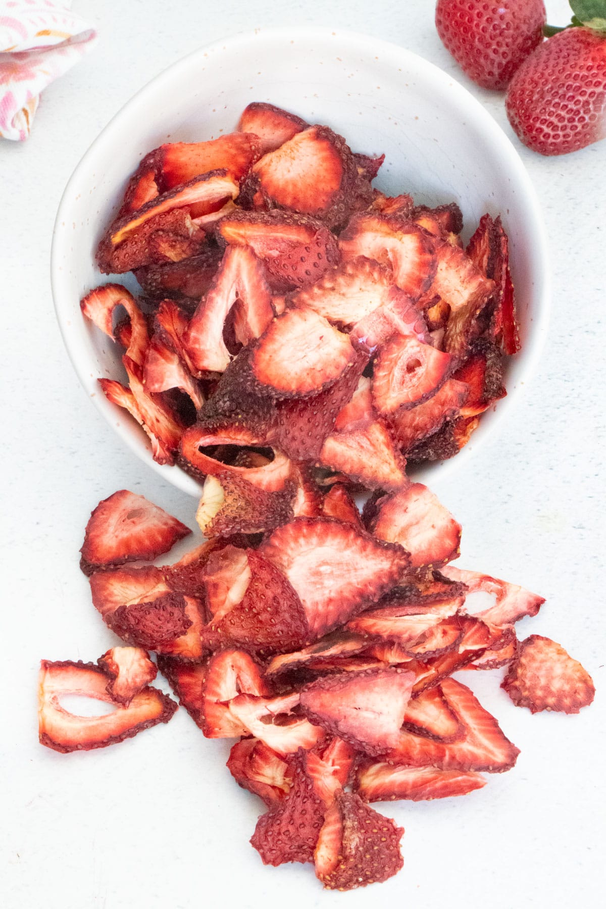 - If using an air fryer: Line air fryer trays with parchment paper. Place the strawberries in a single layer on each tray with space between them to allow for air flow. Press the dehydrate button and lower the temperature to 140ºF or 60ºC then dehydrate for 2-3 hours (see note 4 below).