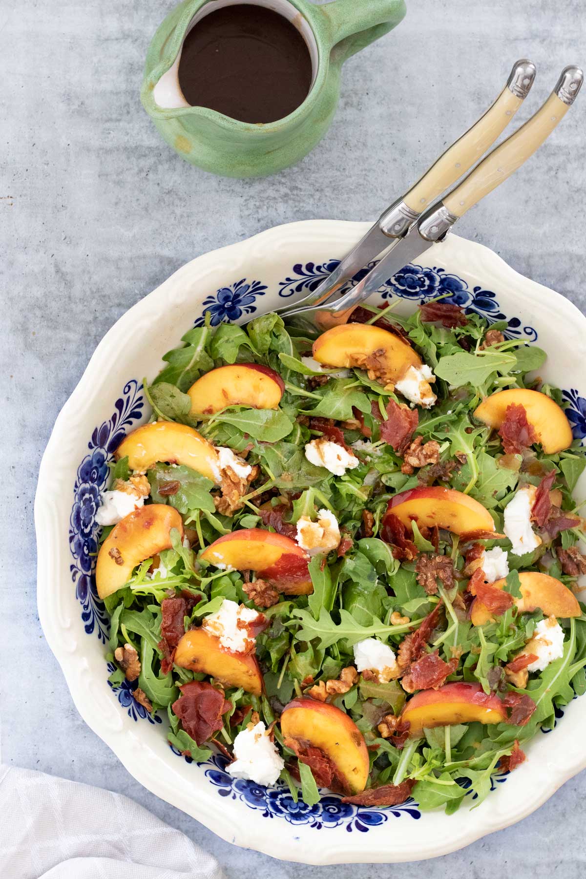 This salad is perfect for long summer days when peaches are found in abundance. Peeling the peaches is not necessary but can be done if preferred. Either yellow or white peaches would work equally well in this recipe. Yellow is great for a big pop of colour though.