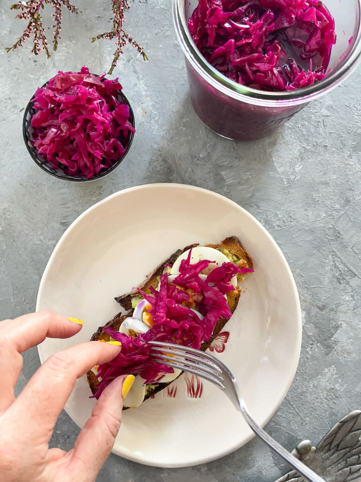 There are lots of delicious ways to enjoy this red sauerkraut brimming with healthy gut bacteria. Add it to nourish bowls, put a spoonful on sandwiches or wraps, top your tacos or homemade hot dogs with it, use it as a side dish, or put it on your avocado toast!