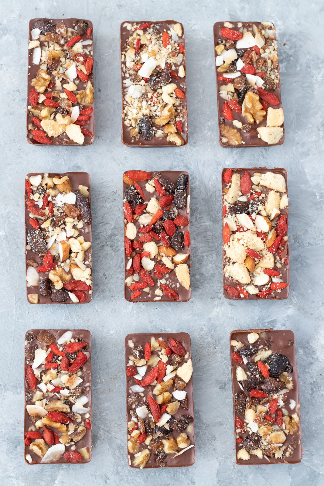 The base recipe stays the same, but what can change are the toppings you choose to use. They can be seasonal with things like shortbread, goji berries and coconut as decorations at Christmas. Or you can simply change it up by using a variety of nuts, seeds, dried fruits, cookies etc. each time you make a new batch.
